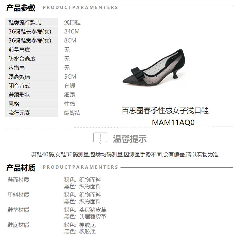 | 参考鞋长(女):24CM | 参考鞋宽(女):8CM | 风格:性感 | 色系:黑色 | 参考标准尺码:36码 |