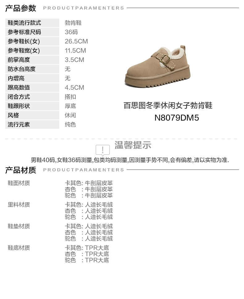 | 制鞋工艺:胶贴皮鞋 | 鞋垫材质:人造长毛绒 | 款式季节:冬季 | 前掌高度:3.5CM | 皮质特征:无 |