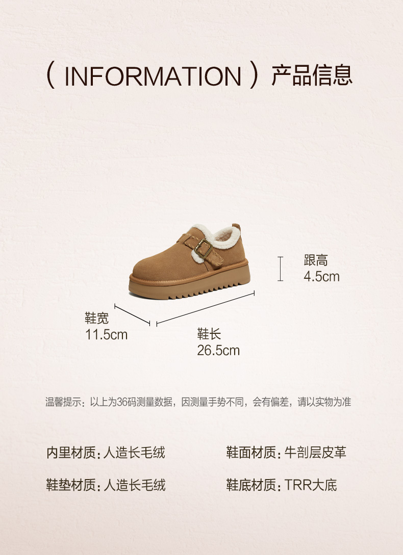| 制鞋工艺:胶贴皮鞋 | 鞋垫材质:人造长毛绒 | 款式季节:冬季 | 前掌高度:3.5CM | 皮质特征:无 |