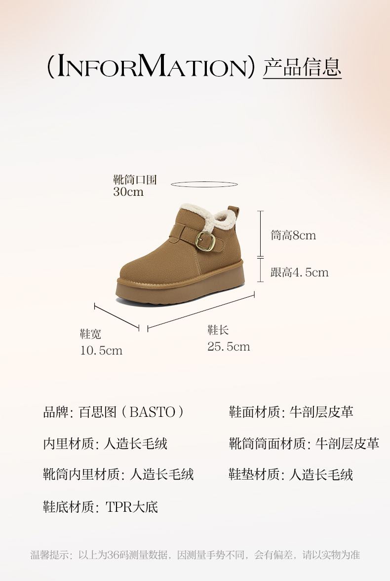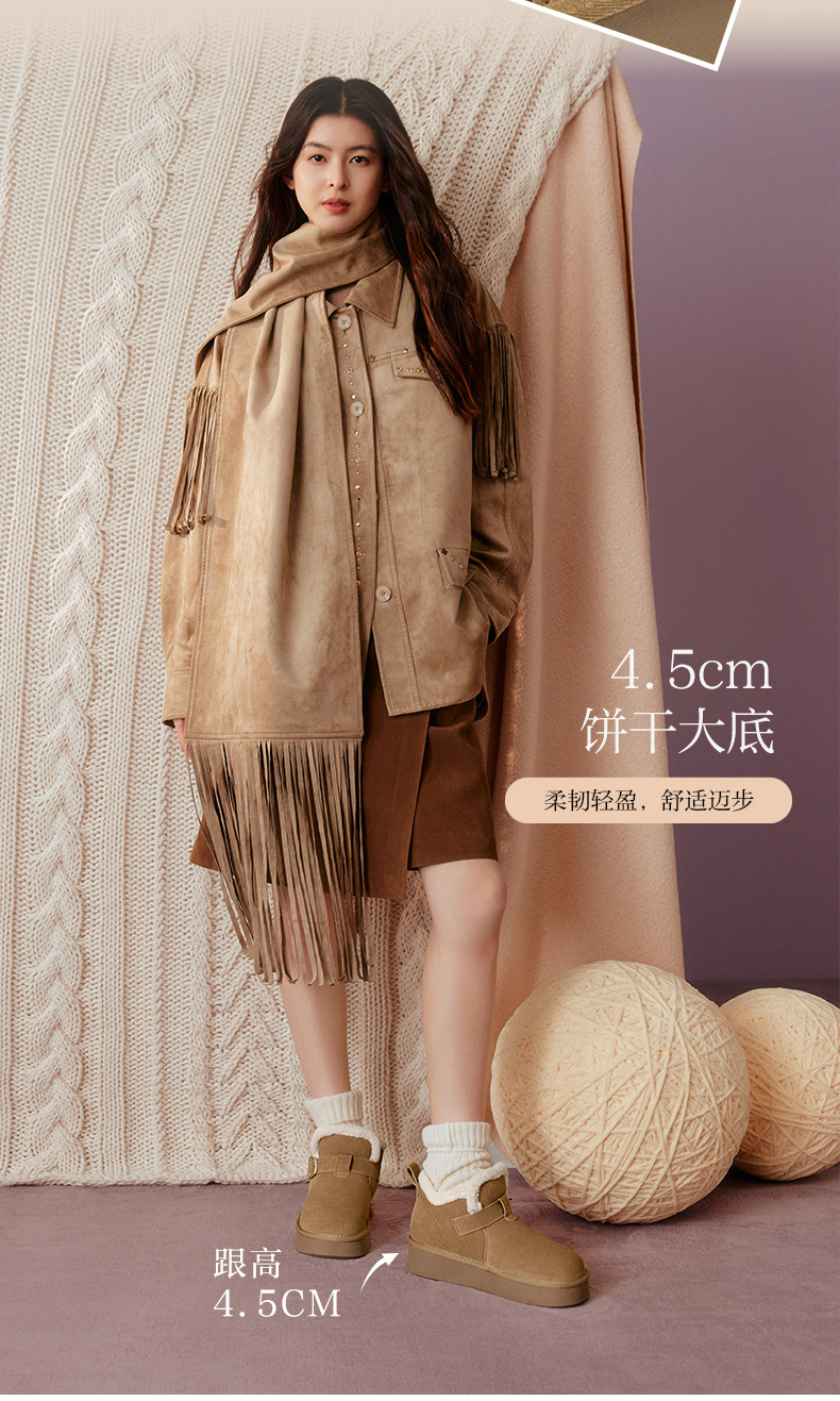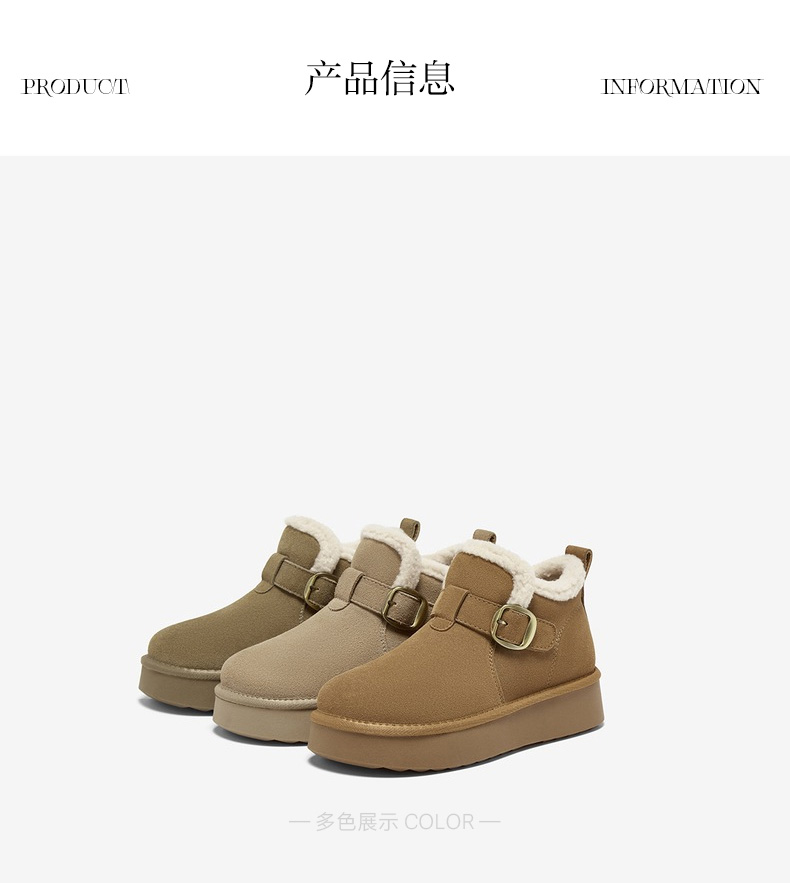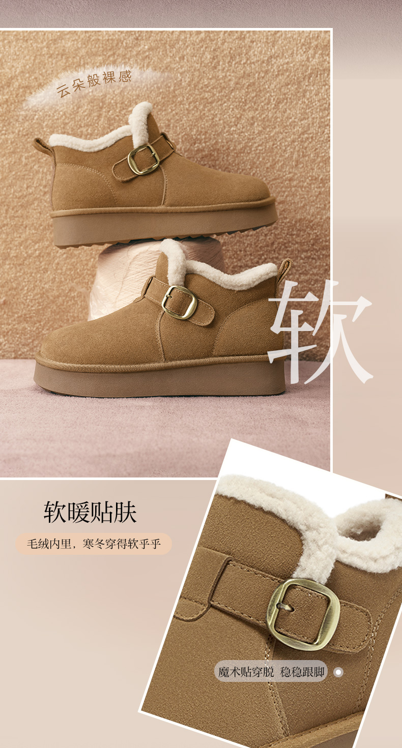 | 帮面材质:牛剖层革 | 配跟:无 | 靴筒口围:30CM | 上市时间:2025年冬季 | 鞋类流行款式:雪地靴 |