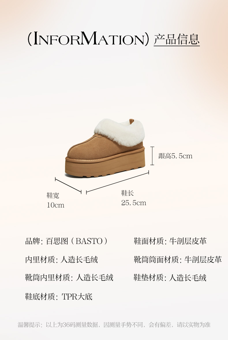 | 制鞋工艺:胶贴皮鞋 | 鞋垫材质:人造长毛绒 | 款式季节:冬季 | 前掌高度:5CM | 皮质特征:无 |