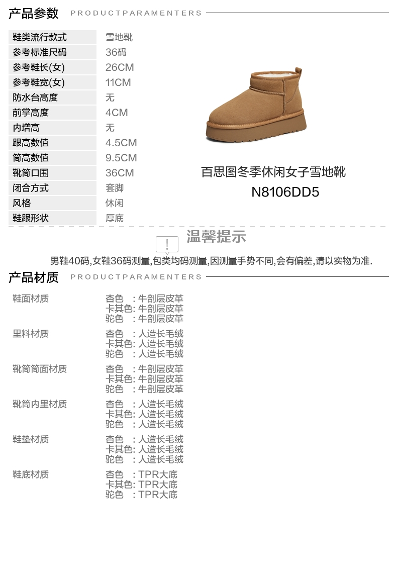 | 款式季节:冬季 | 前掌高度:4CM | 皮质特征:无 | 防水台高度:无 |