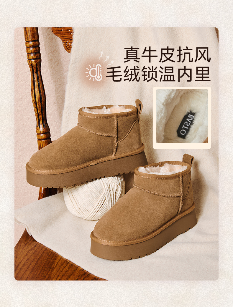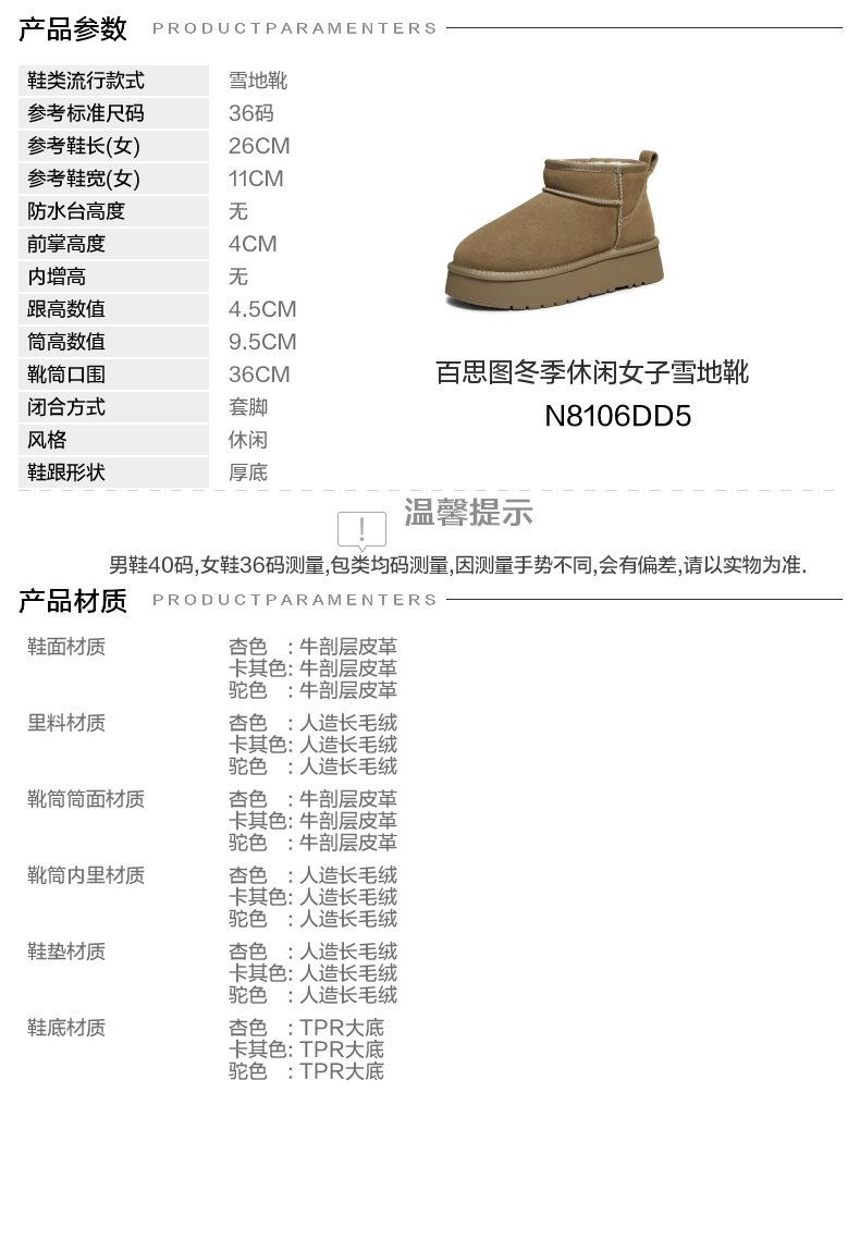 | 帮面材质:牛剖层革 | 配跟:无 | 靴筒口围:36CM | 上市时间:2025年冬季 | 鞋类流行款式:雪地靴 |