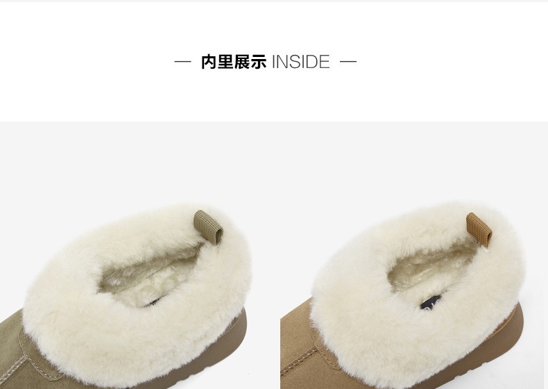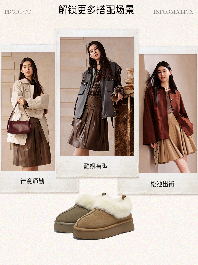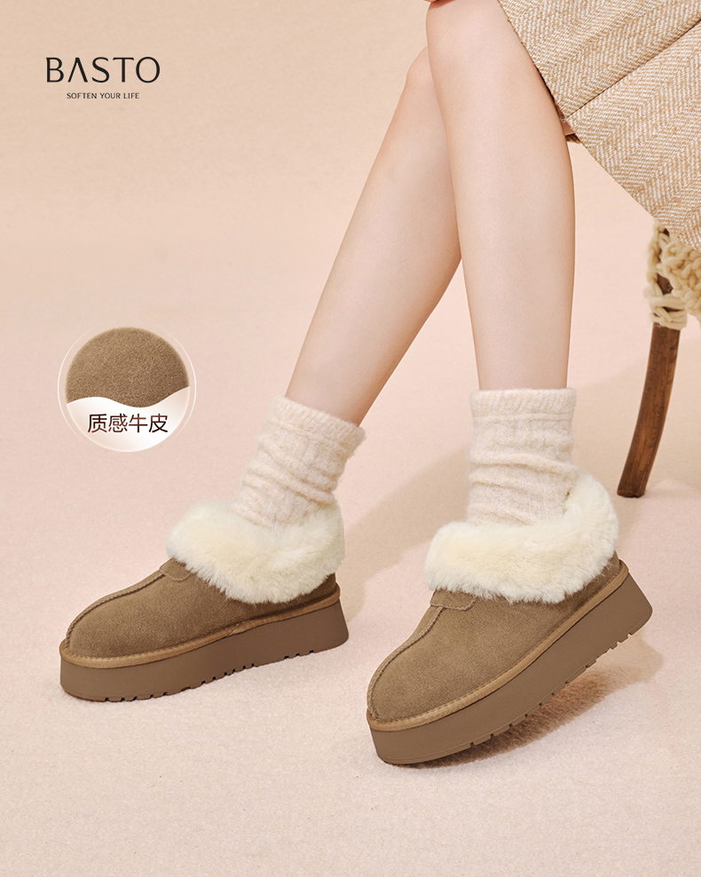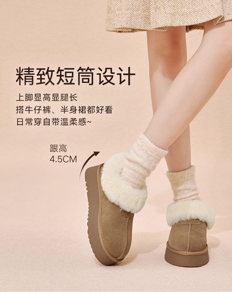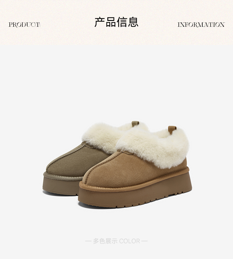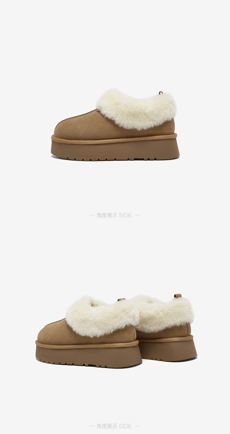 | 帮面材质:织物牛剖层革 | 配跟:无 | 靴筒口围:32CM | 上市时间:2025年冬季 | 鞋类流行款式:雪地靴 |