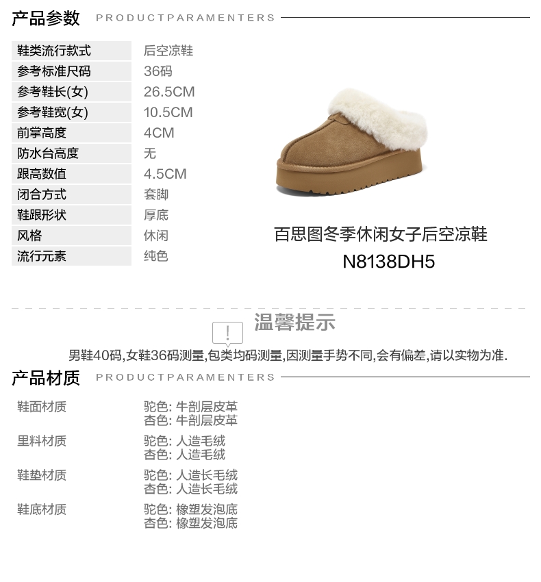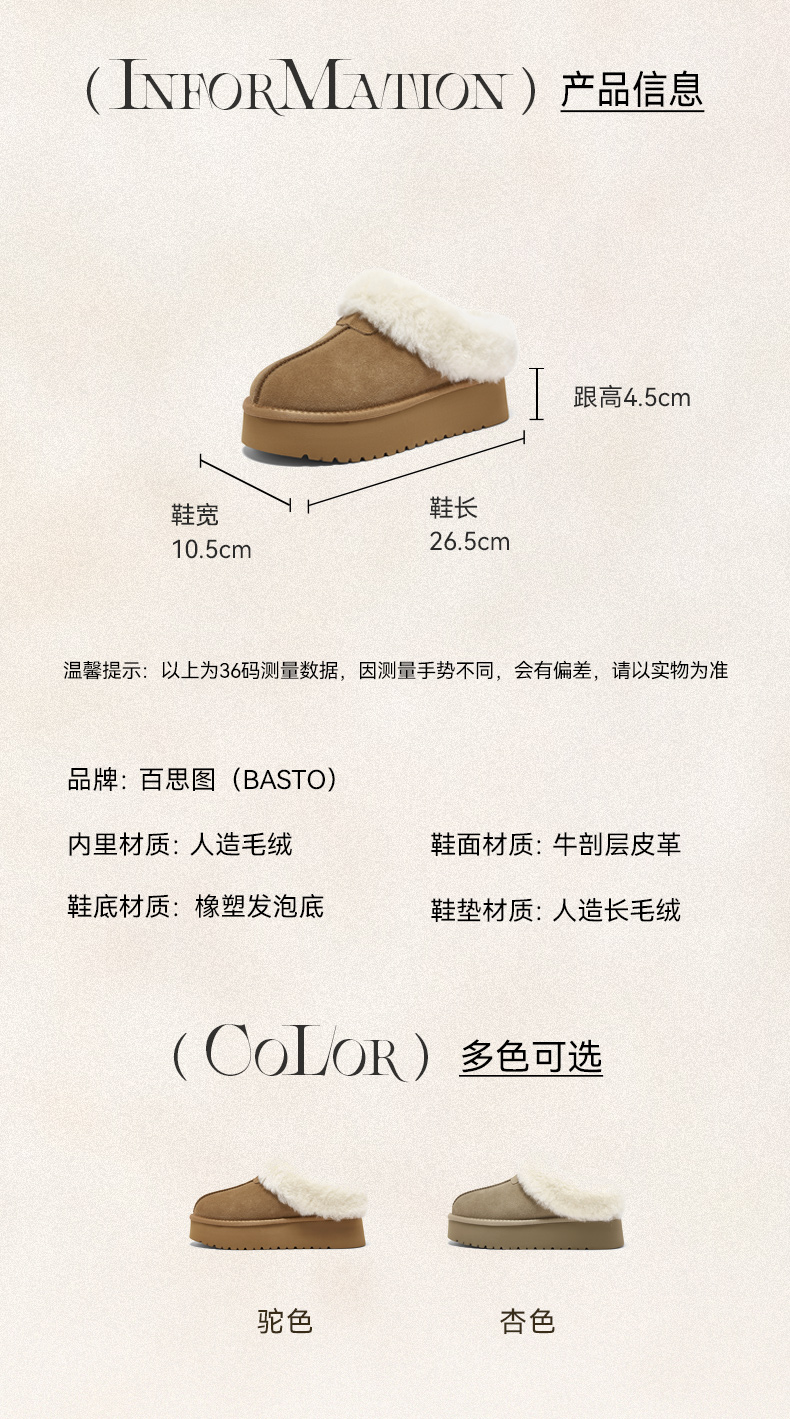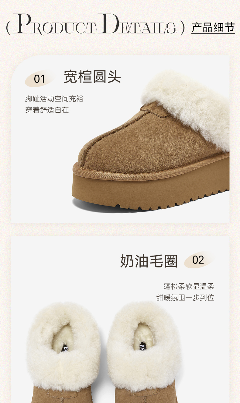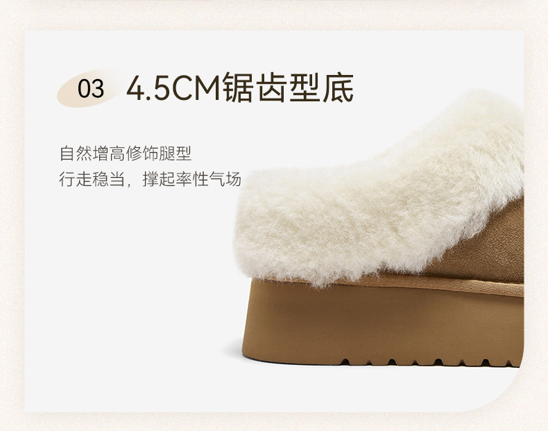 | 上市时间:2025年冬季 | 制鞋工艺:胶贴皮鞋 | 款式季节:冬季 | 鞋垫材质:人造长毛绒 | 前掌高度:4CM |