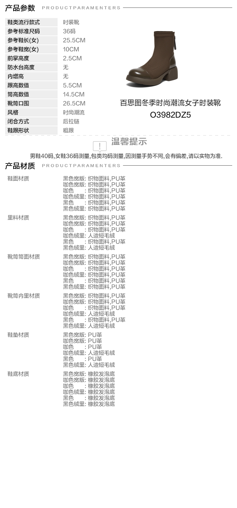 | 鞋底材质:橡胶发泡底 | 靴筒内里材质:织物面料PU革 | 内增高:无 | 鞋面材质:PU革织物面料 | 闭合方式:后拉链 |