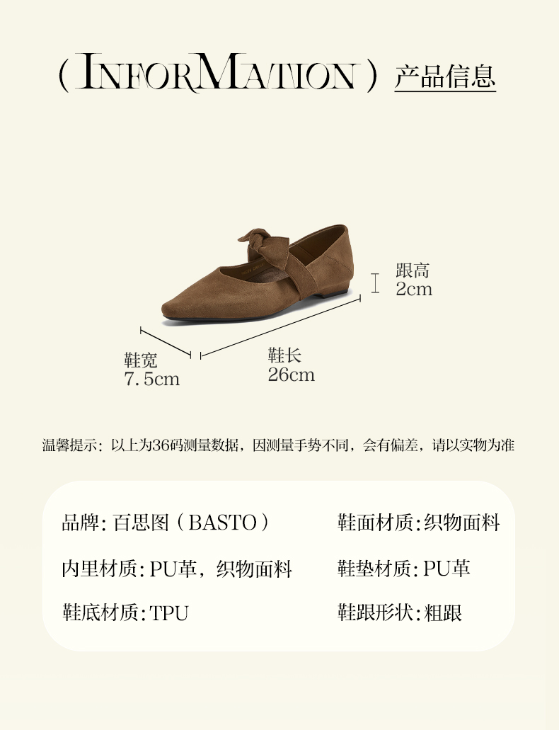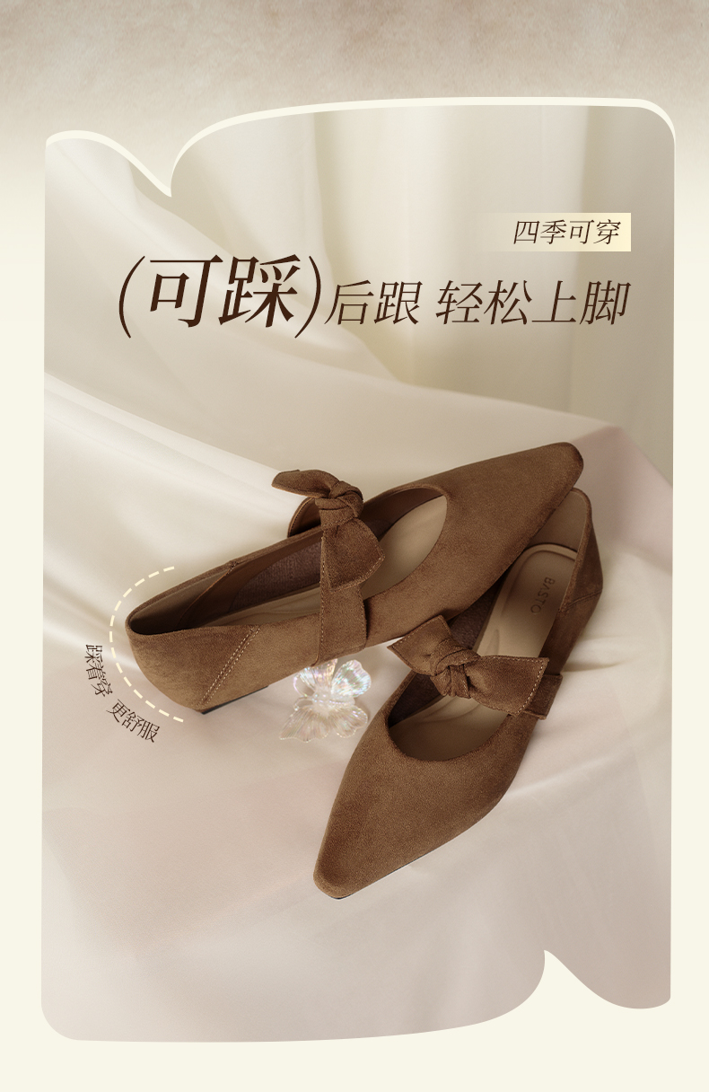 BASTO(百思图),品牌拥有17年历史,秉承优雅、甜美、清新的设计理念,主张“好嫁风”的产品风格,将甜美俏丽的少女情怀融合优雅气质的时尚品味,塑造出唯美优雅、受欢迎的女鞋款式。主打以女性温柔与亲和力为特色的流行时尚产品,糅合雅致又富有亲和力的裸粉色调,淑媛端庄、清新甜美。目前品牌已开设线下门店达1400多家。