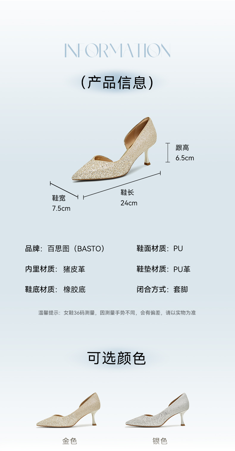 | 鞋头款式:尖头 | 鞋底材质:橡胶底 | 鞋面图案:纯色 | 鞋跟形状:细跟 | 鞋面材质:PU |