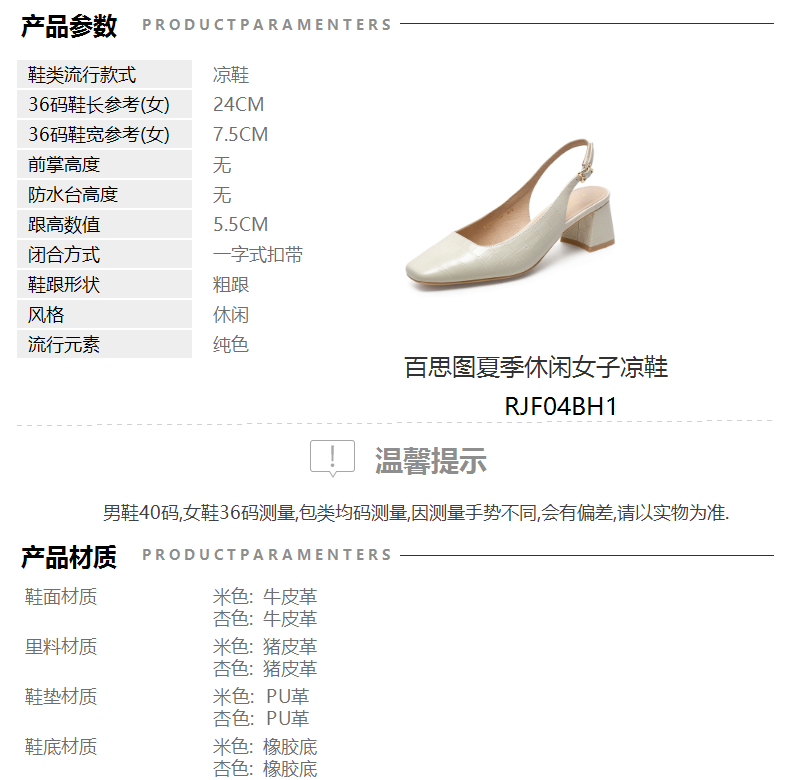 | 跟高数值:5.5CM | 色系:米色 | 货品来源:自产 | 配跟:无 | 性别:女子 |