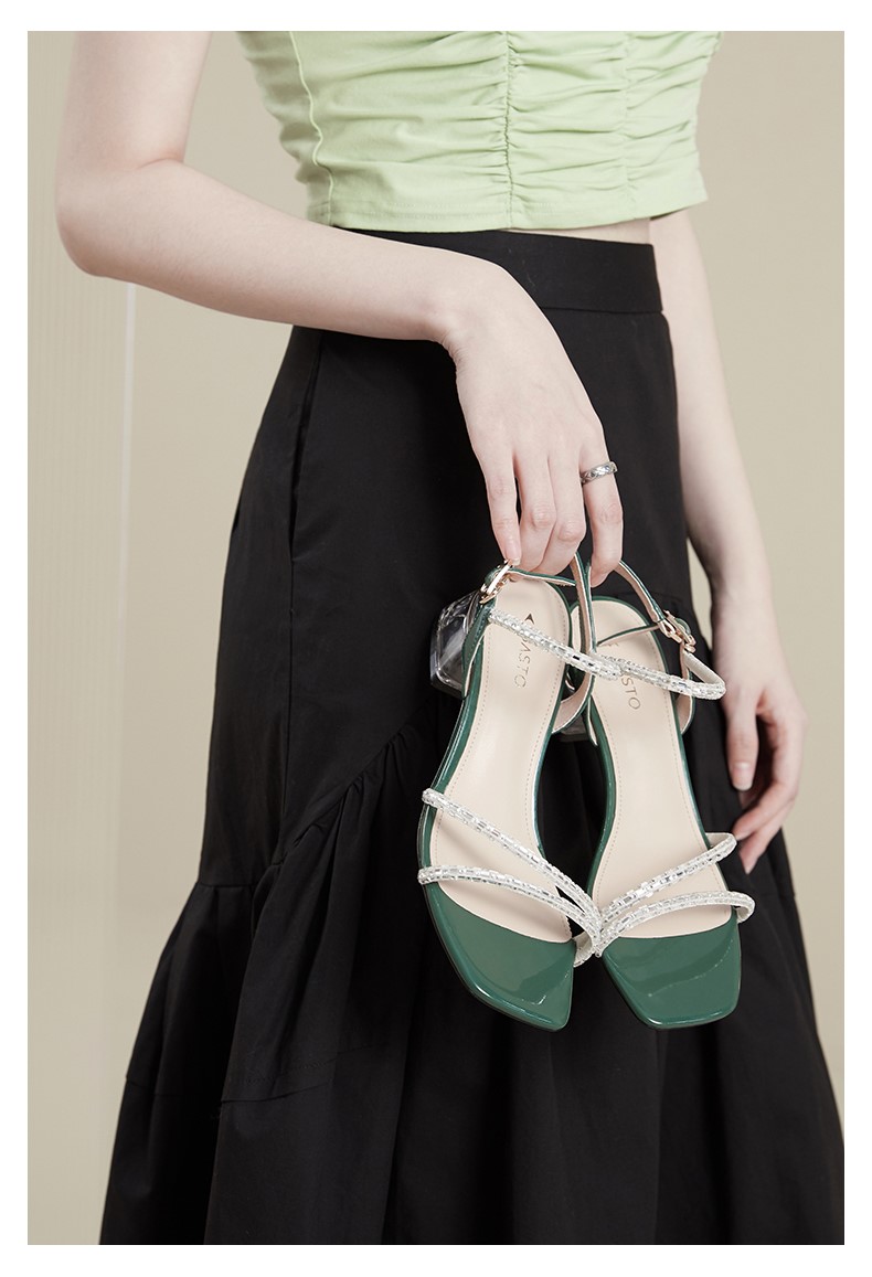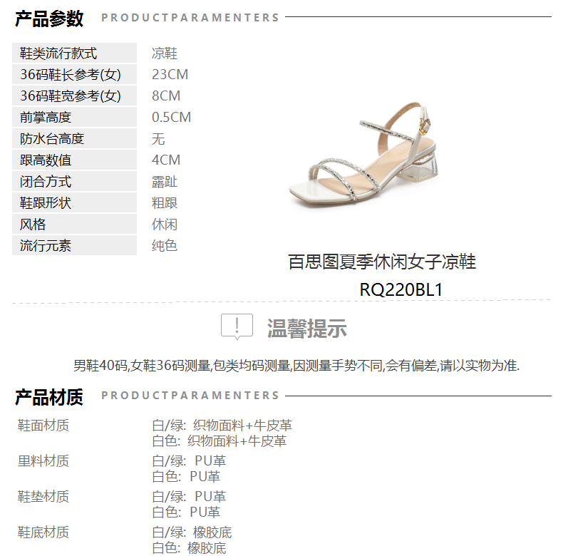 | 鞋头款式:露趾 | 鞋底材质:橡胶底 | 鞋面图案:纯色 | 鞋跟形状:粗跟 | 鞋面材质:织物面料牛皮革 |