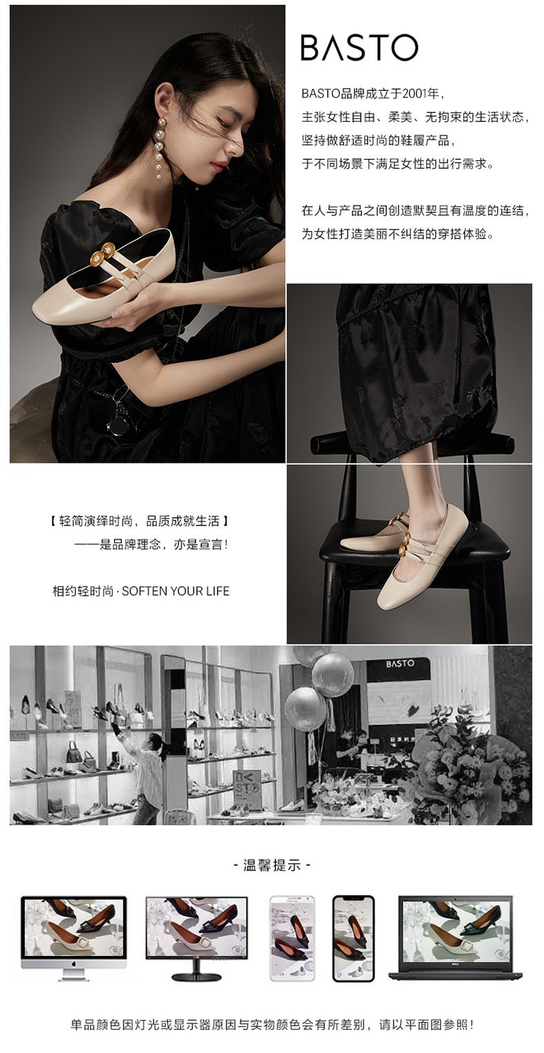 BASTO(百思图),品牌拥有17年历史,秉承优雅、甜美、清新的设计理念,主张“好嫁风”的产品风格,将甜美俏丽的少女情怀融合优雅气质的时尚品味,塑造出唯美优雅、受欢迎的女鞋款式。主打以女性温柔与亲和力为特色的流行时尚产品,糅合雅致又富有亲和力的裸粉色调,淑媛端庄、清新甜美。目前品牌已开设线下门店达1400多家。