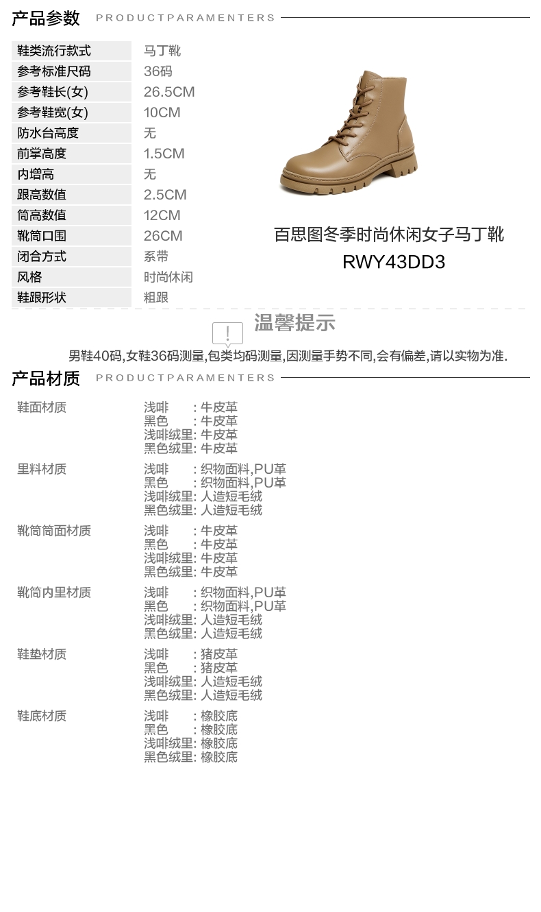 | 款式季节:冬季 | 鞋垫材质:猪皮革 | 渠道划分:线下同步 | 前掌高度:1.5CM | 皮质特征:牛皮革 |