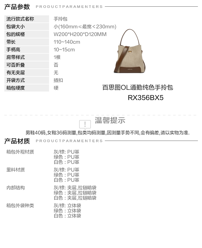 | 适用场景:通勤 | 开袋方式:插扣 | 性别:女子 | 手柄高:10~15cm | 里料材质:PU革 |