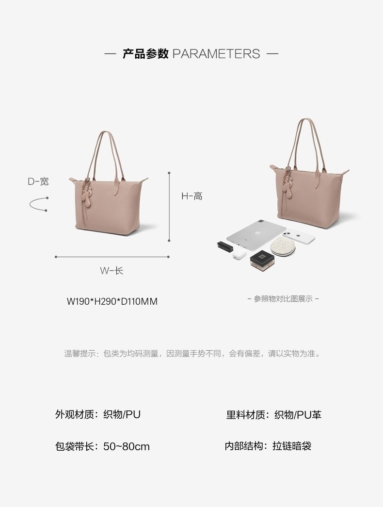 | 闭合方式:拉链 | 所在区域:电子商务 | 是否防水:否 | 风格分类:托特包 | 上市时间:2025年夏季 |