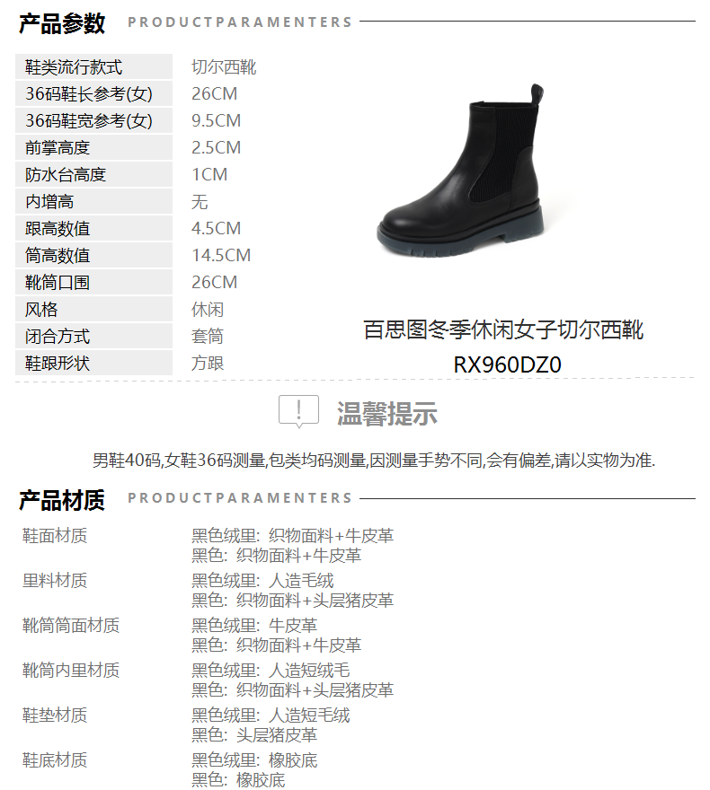 | 鞋底材质:橡胶底 | 靴筒内里材质:织物面料头层猪皮革 | 内增高:无 | 鞋面材质:牛皮革织物面料 | 闭合方式:套筒 |