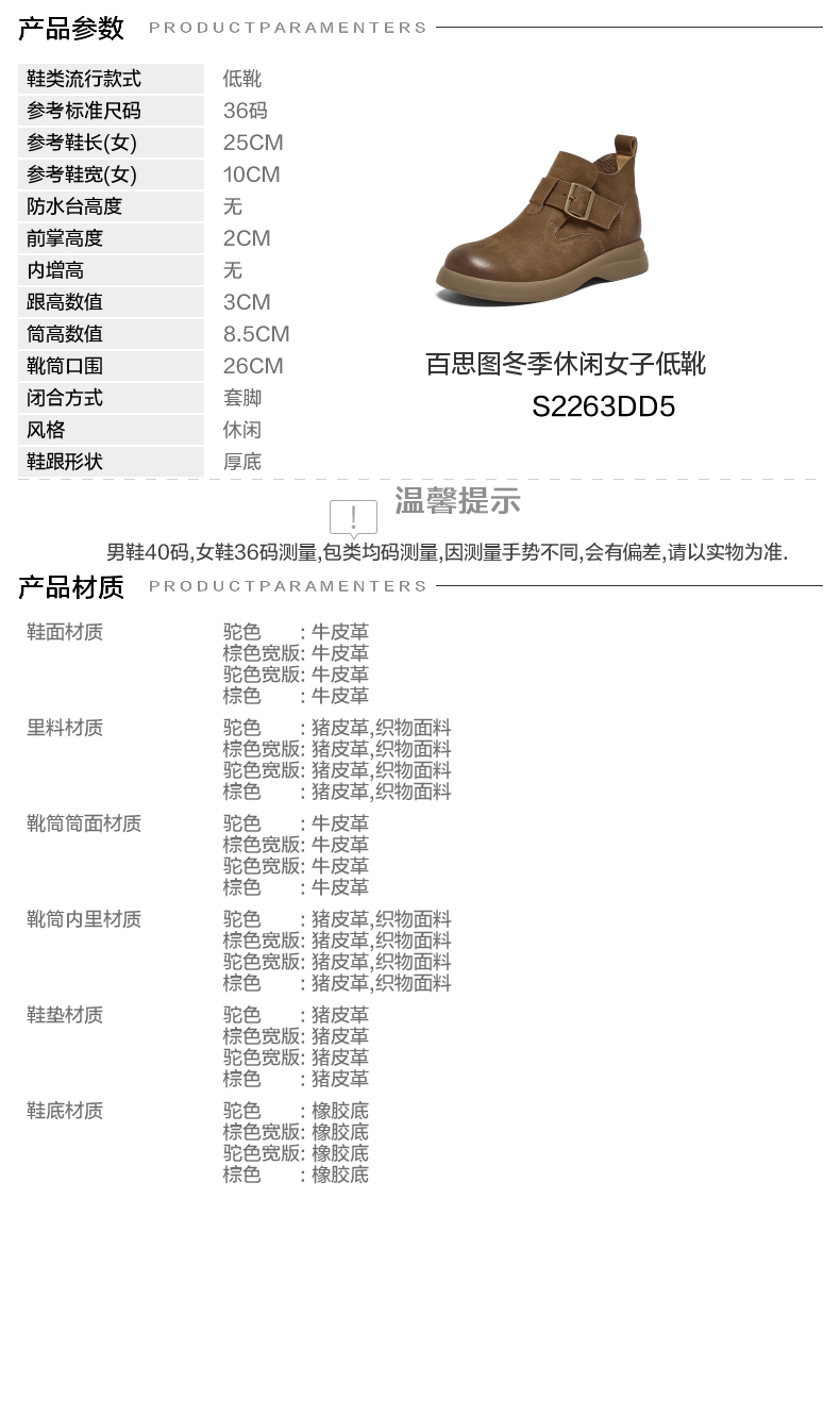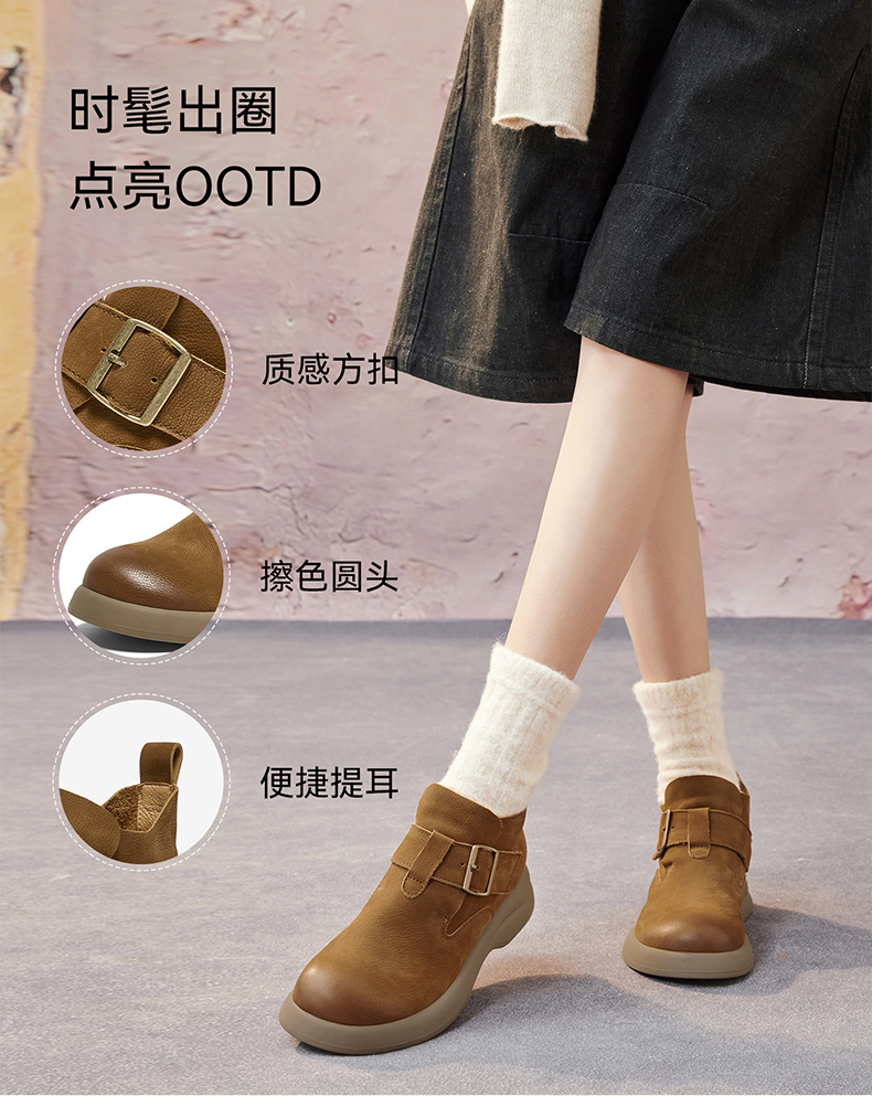 | 帮面材质:牛皮革 | 配跟:无 | 靴筒口围:26CM | 上市时间:2025年冬季 | 鞋类流行款式:低靴 |