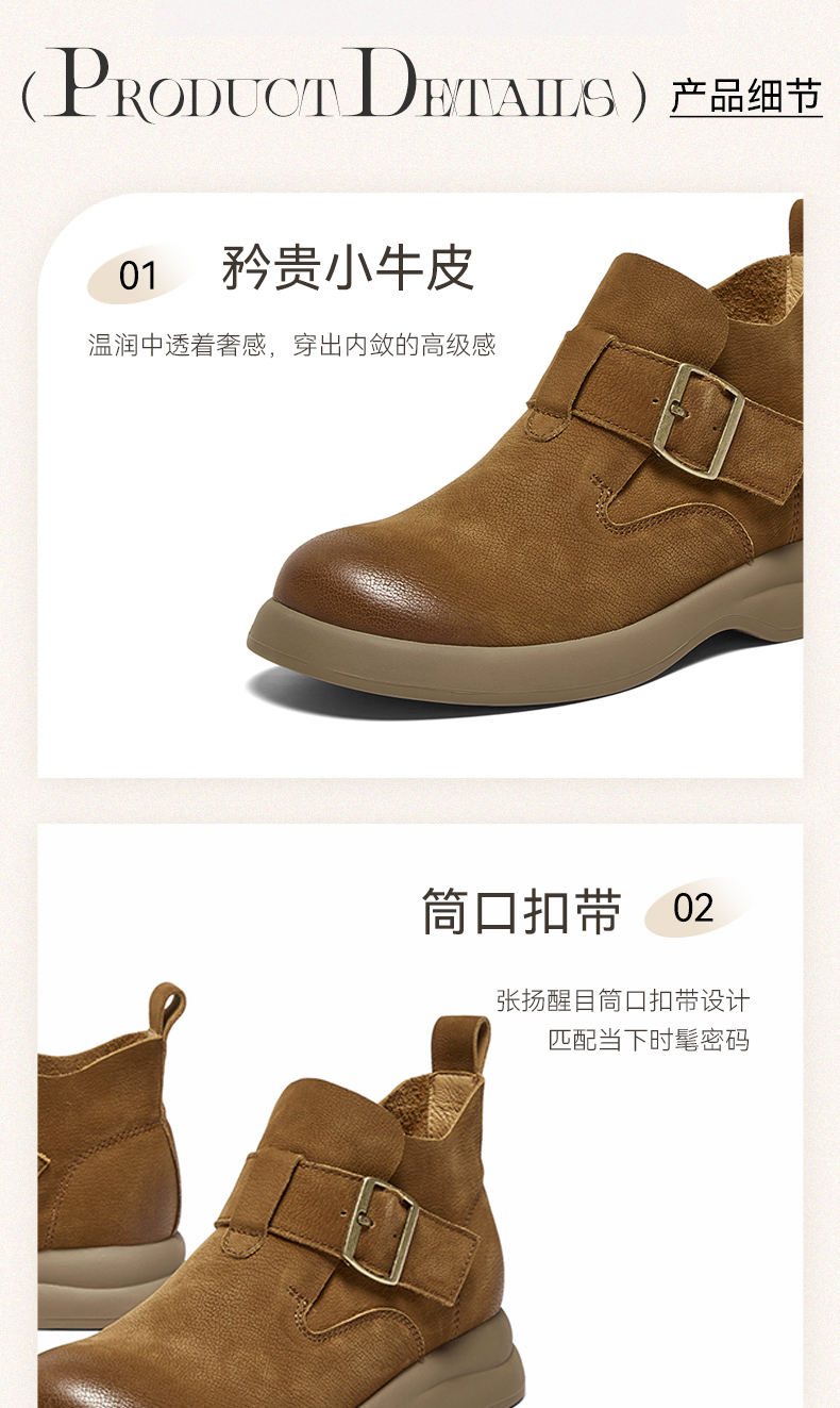 | 帮面材质:牛皮革 | 配跟:无 | 靴筒口围:26CM | 上市时间:2025年冬季 | 鞋类流行款式:低靴 |