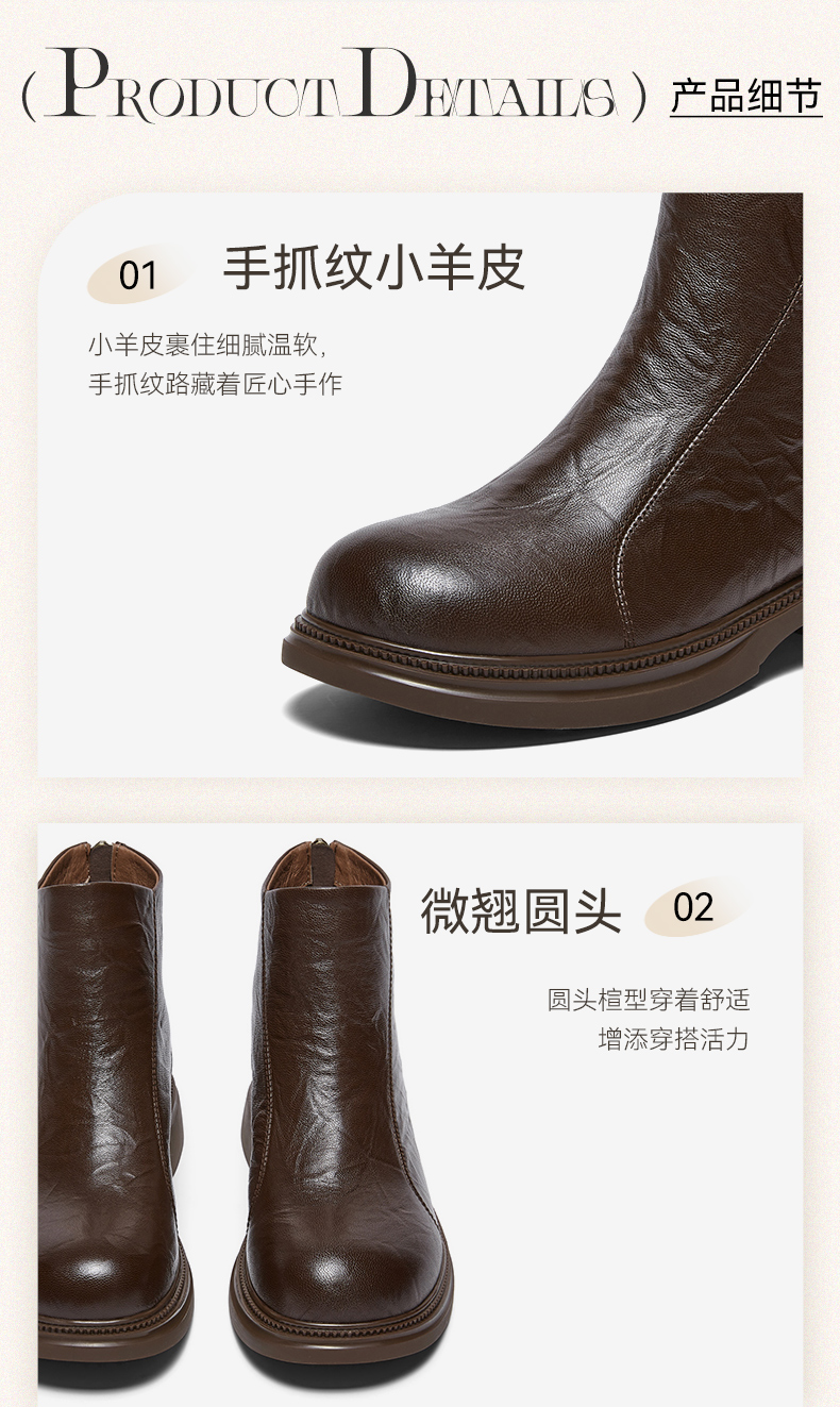 | 帮面材质:羊皮 | 配跟:无 | 靴筒口围:27CM | 上市时间:2025年冬季 | 鞋类流行款式:短靴 |