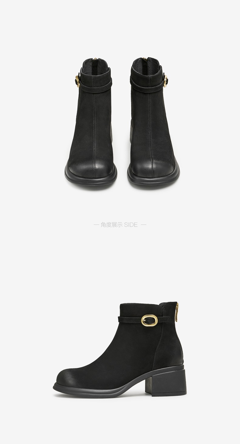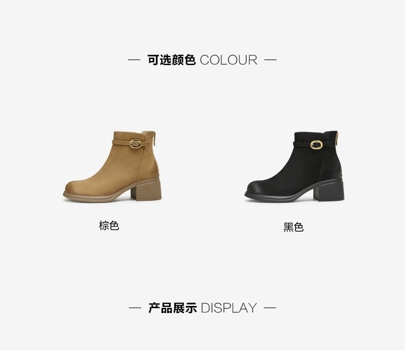 鞋类流行款式:时装靴 鞋头款式:圆头 执行标准:舒适上班鞋Q/LR001-2023 跟高范围:中跟鞋(3-5CM) 鞋面图案:纯色