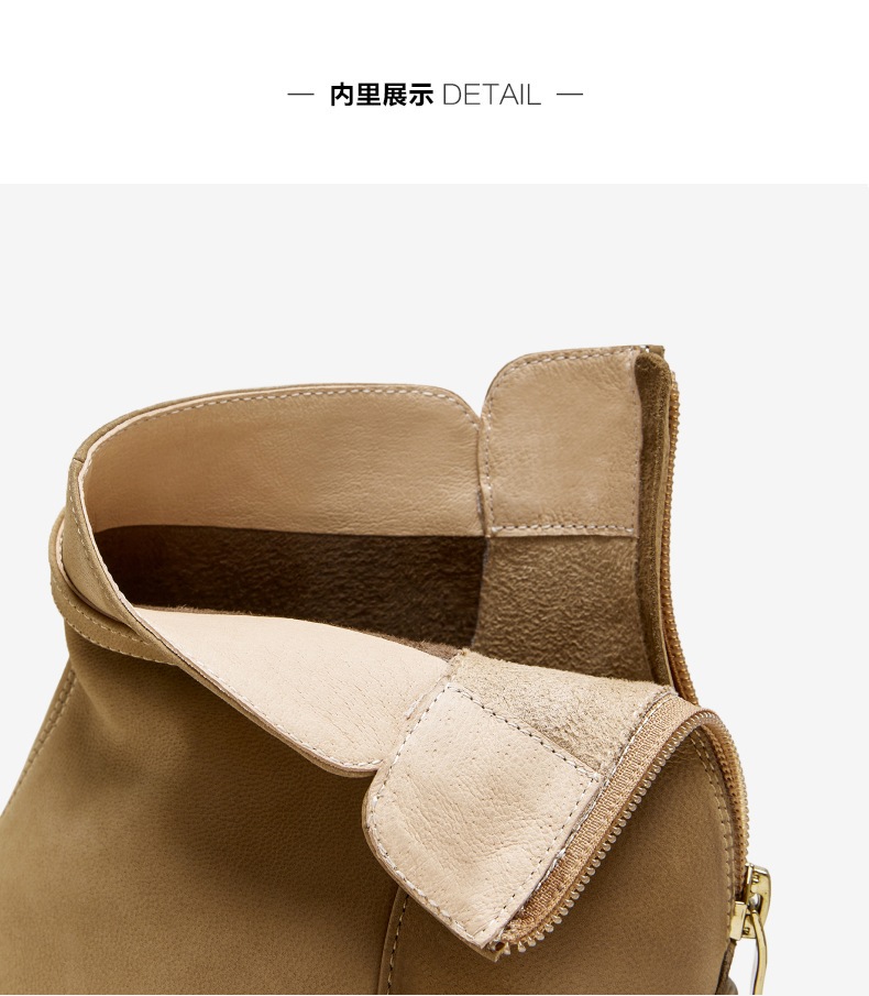 筒高数值:12CM 性别:女子 靴筒筒面材质:羊皮革 里料材质:人造短毛绒 制鞋工艺:胶贴皮鞋