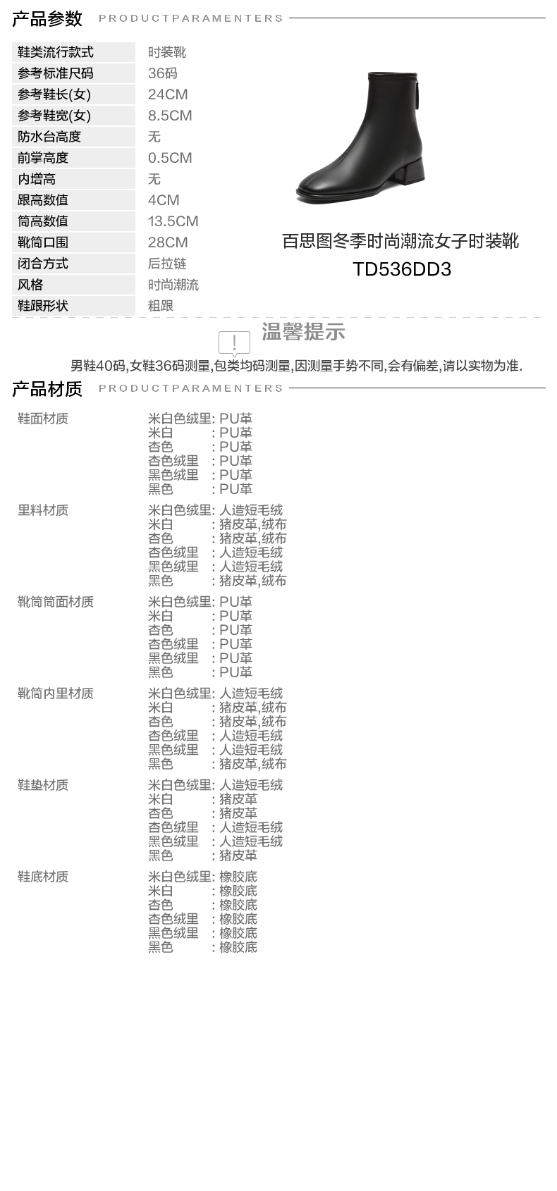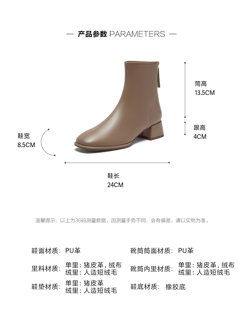 | 鞋类流行款式:时装靴 | 鞋头款式:圆头 | 执行标准:皮鞋 QB/T1002-2015 | 跟高范围:中跟鞋(3-5CM) | 鞋面图案:纯色 |