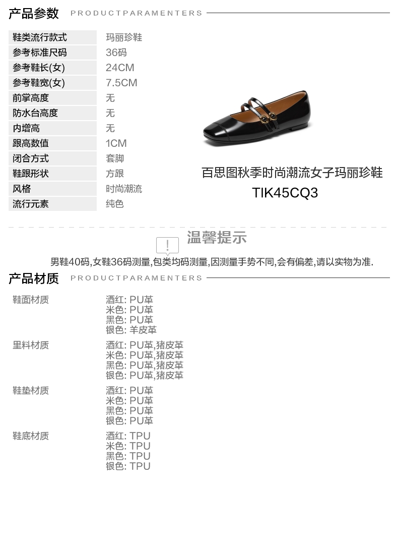 | 闭合方式:套脚 | 所在区域:电子商务 | 配跟:无 | 开口深度:浅口 | 风格分类:玛丽珍鞋 |