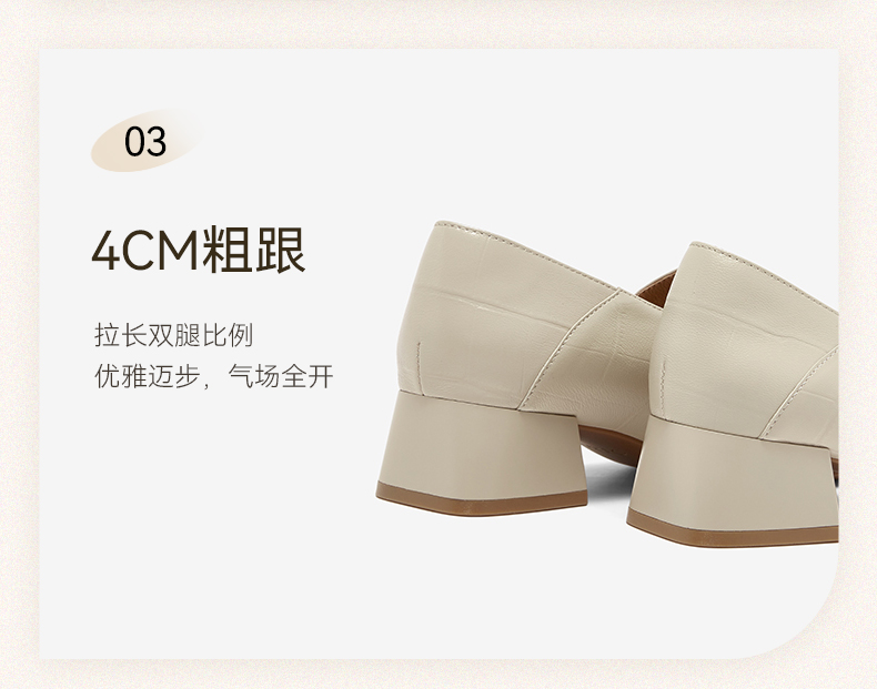 | 色系:米色 | 跟高数值:4CM | 性别:女子 | 里料材质:猪皮革PU革织物面料 | 制鞋工艺:胶贴皮鞋 |