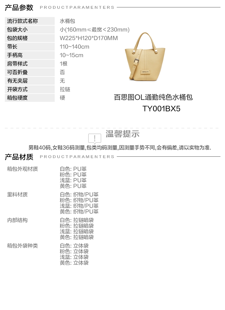 | 适用场景:通勤 | 开袋方式:拉链 | 性别:女子 | 手柄高:10~15cm | 里料材质:织物/PU革 |
