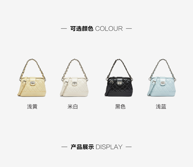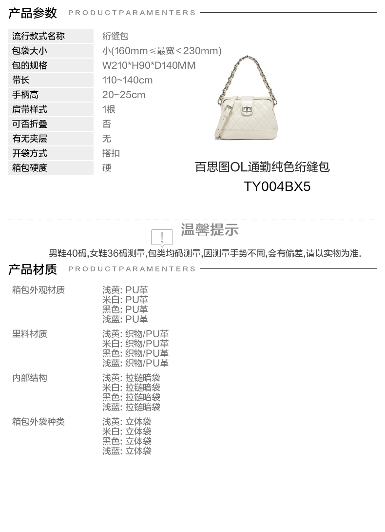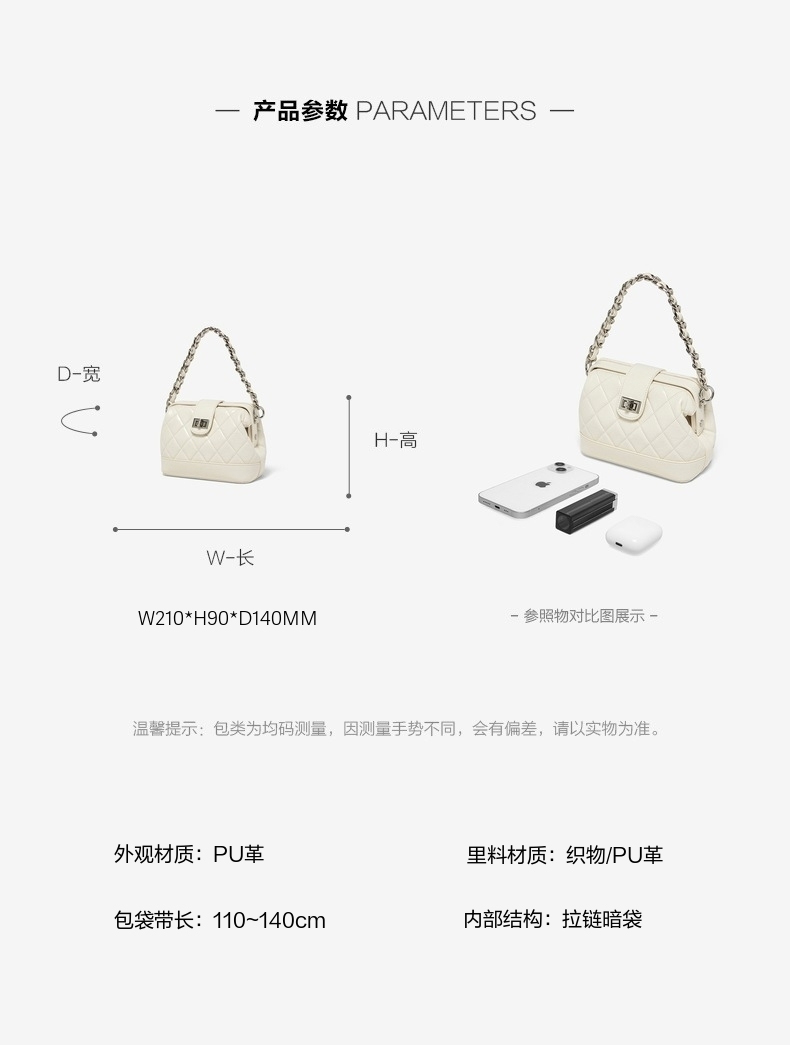 | 包的规格:W210*H90*D140MM | 内部结构:拉链暗袋 | 背带方式:单肩/斜挎 | 风格:OL通勤 | 色系:米白 |