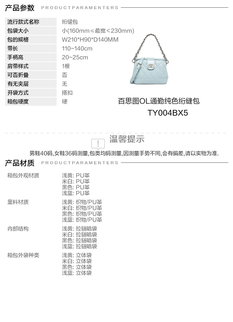 | 款式季节:夏季 | 材质工艺:PU | 皮质特征:PU | 箱包硬度:硬 | 箱包外观材质:PU革 |