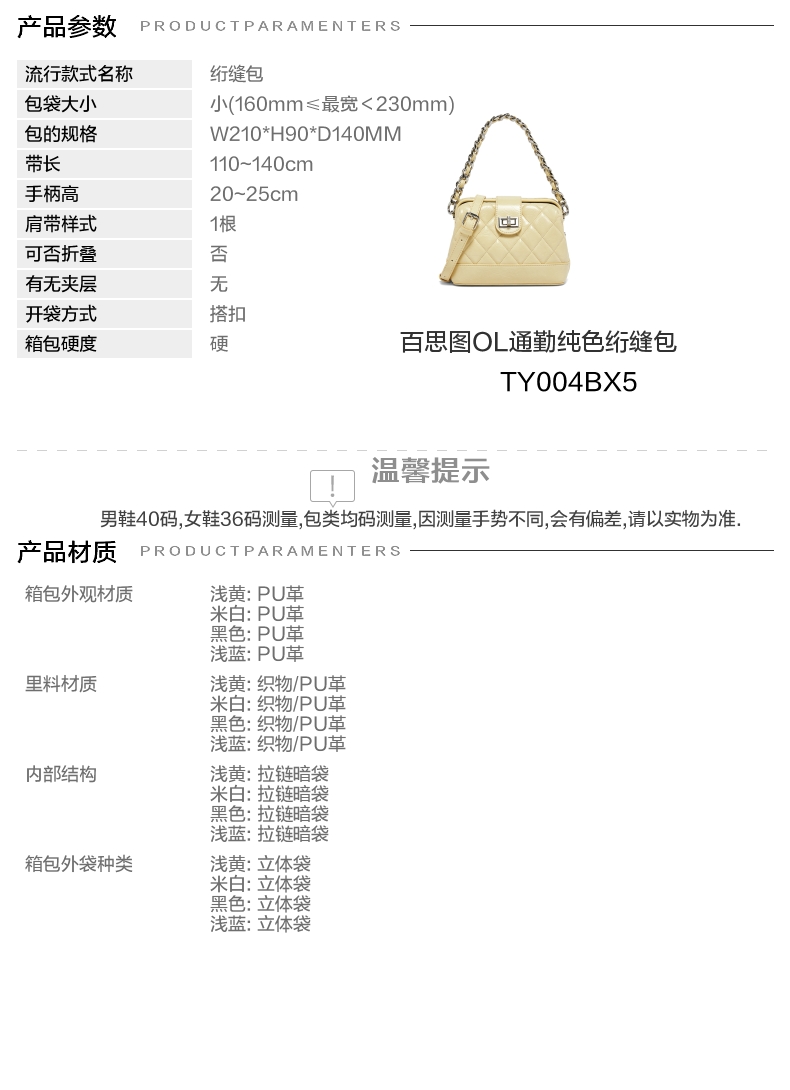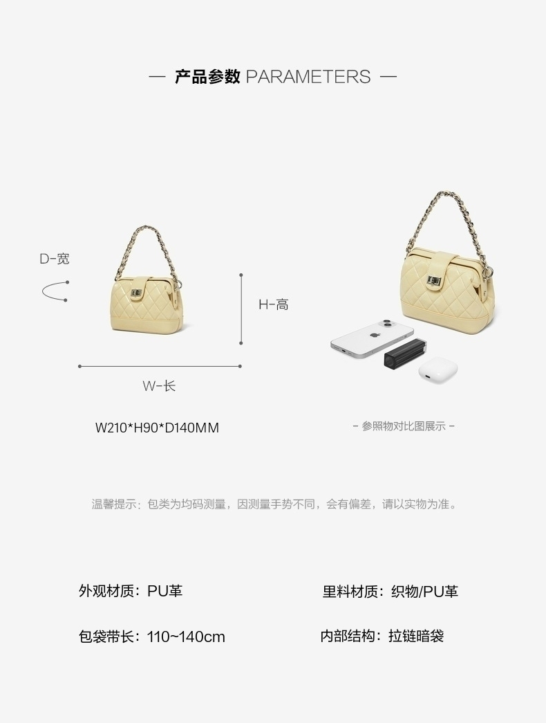 | 包的规格:W210*H90*D140MM | 内部结构:拉链暗袋 | 背带方式:单肩/斜挎 | 风格:OL通勤 | 色系:黄色 |