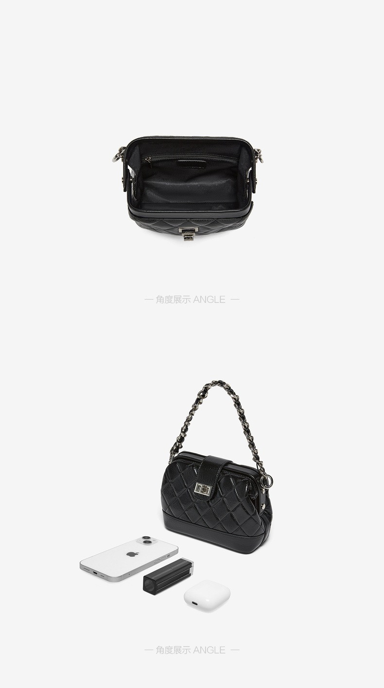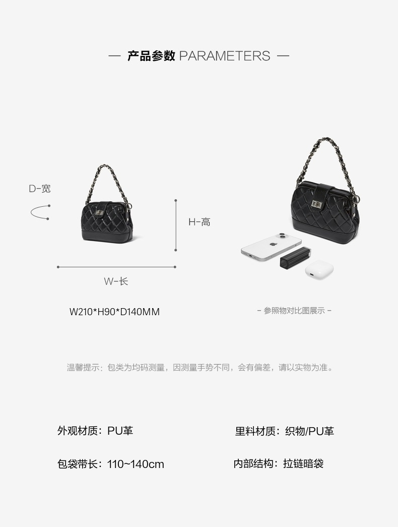 | 包的规格:W210*H90*D140MM | 内部结构:拉链暗袋 | 背带方式:单肩/斜挎 | 风格:OL通勤 | 色系:黑色 |
