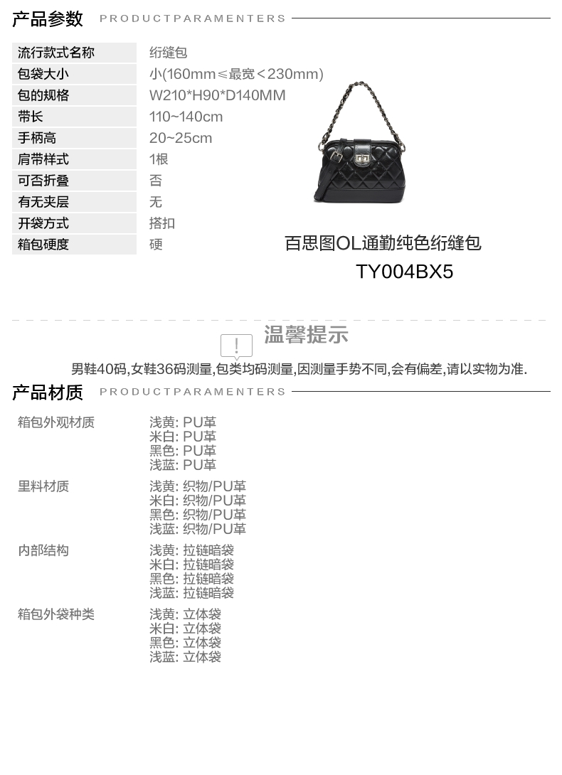 | 适用场景:通勤 | 开袋方式:搭扣 | 性别:女子 | 手柄高:20~25cm | 里料材质:织物/PU革 |