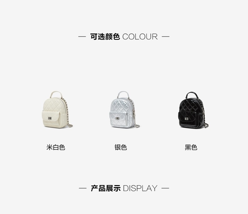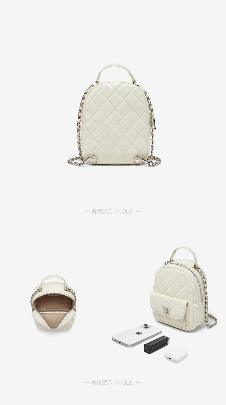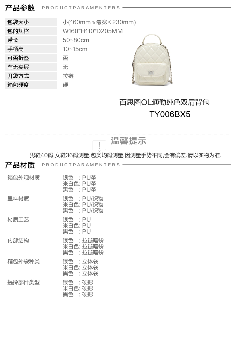 | 包的规格:W160*H110*D205MM | 内部结构:拉链暗袋 | 背带方式:双肩 | 风格:OL通勤 | 色系:白色 |