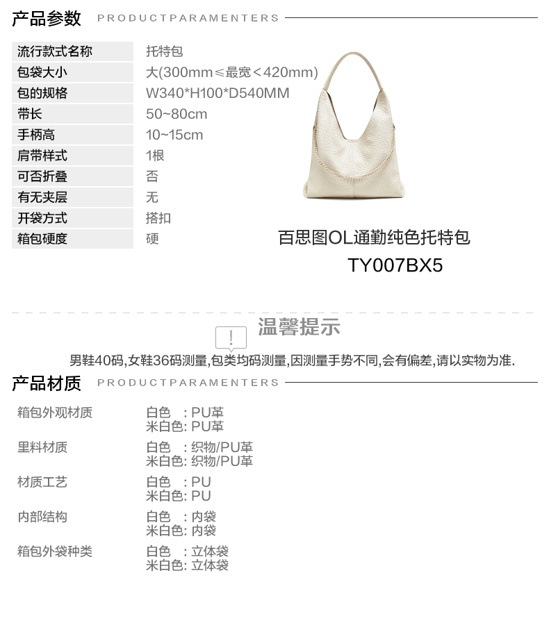 | 色系:白色 | 适用场景:通勤 | 开袋方式:搭扣 | 性别:女子 | 是否防水:否 |
