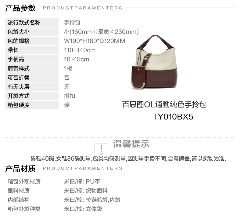 | 色系:米白 | 适用场景:通勤 | 开袋方式:搭扣 | 性别:女子 | 是否防水:否 |
