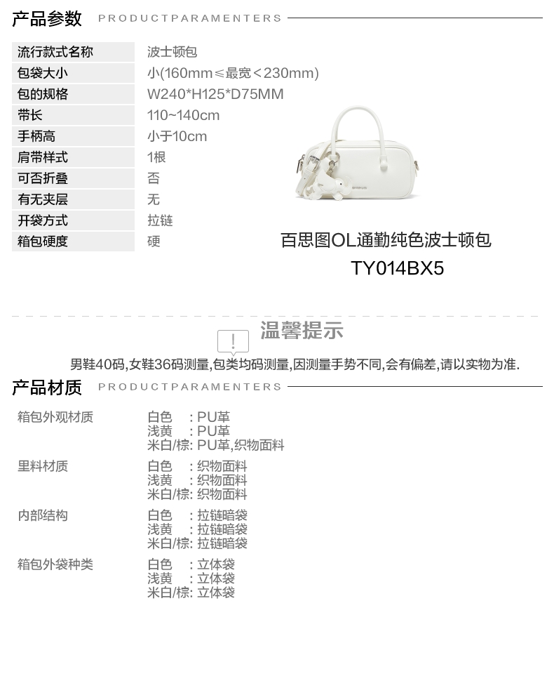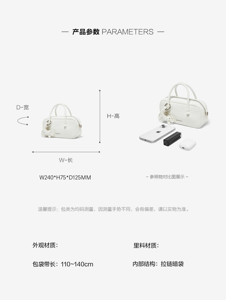 | 包的规格:W240*H125*D75MM | 内部结构:拉链暗袋 | 背带方式:单肩/斜挎 | 风格:OL通勤 | 色系:白色 |