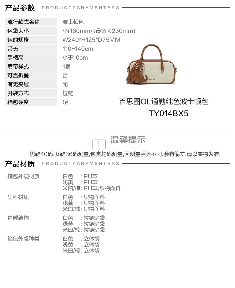 | 包的规格:W240*H125*D75MM | 内部结构:拉链暗袋 | 背带方式:单肩/斜挎 | 风格:OL通勤 | 色系:米白 |