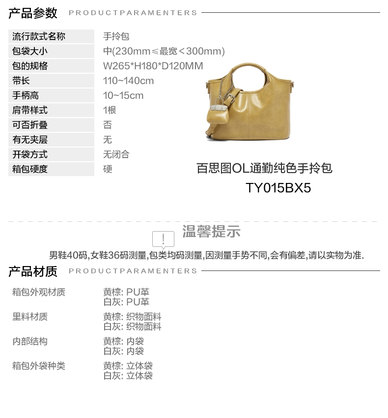 | 适用场景:通勤 | 开袋方式:无闭合 | 性别:女子 | 手柄高:10~15cm | 里料材质:织物面料 |