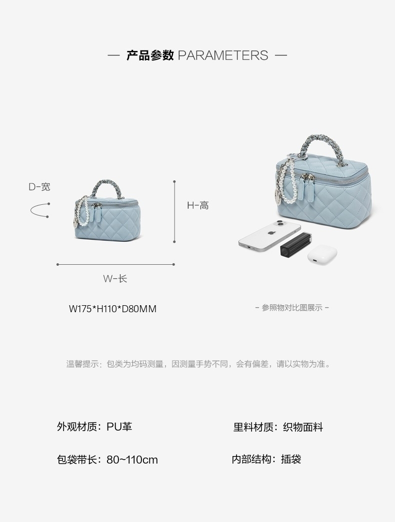 | 包的规格:W175*H110*D80MM | 内部结构:插袋 | 背带方式:单肩/斜挎 | 风格:OL通勤 | 色系:蓝色 |