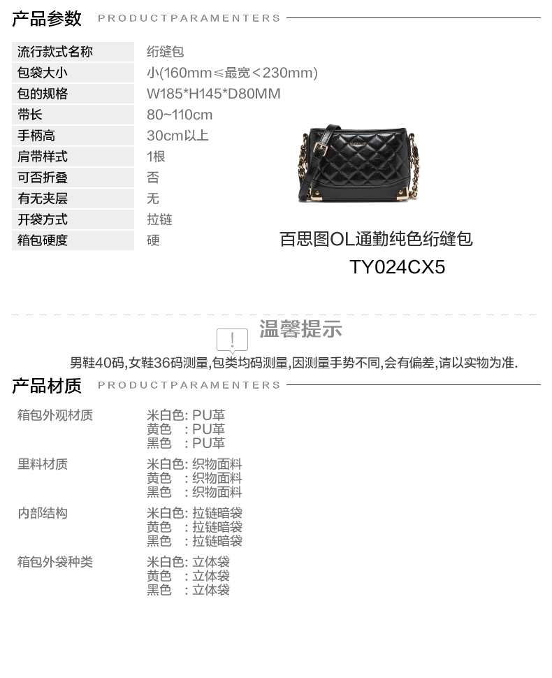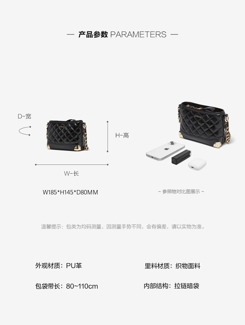 | 包的规格:W185*H145*D80MM | 内部结构:拉链暗袋 | 背带方式:单肩/斜挎 | 风格:OL通勤 | 色系:黑色 |