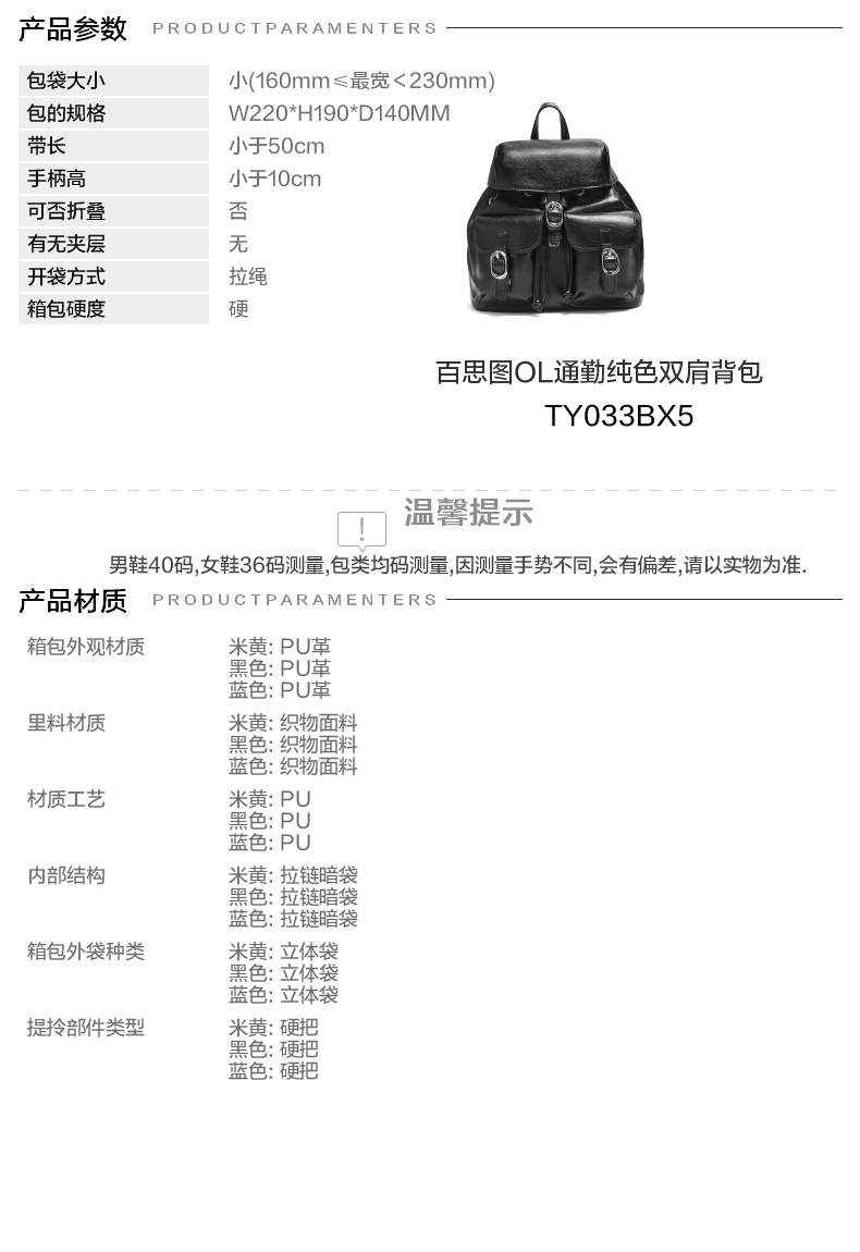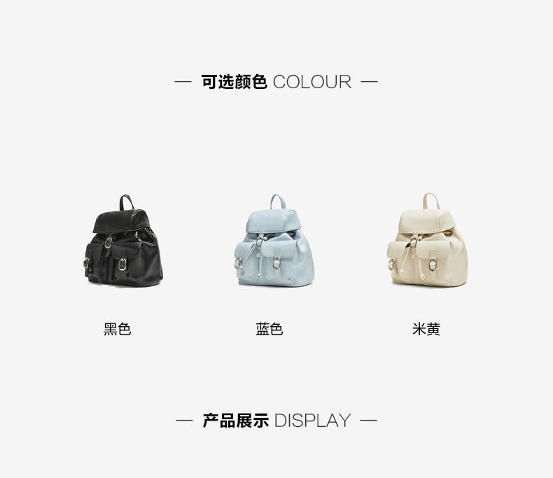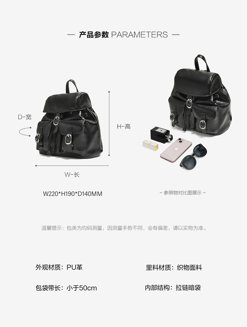 | 流行元素:纯色 | 包的规格:W220*H190*D140MM | 内部结构:拉链暗袋 | 背带方式:双肩 | 风格:OL通勤 |