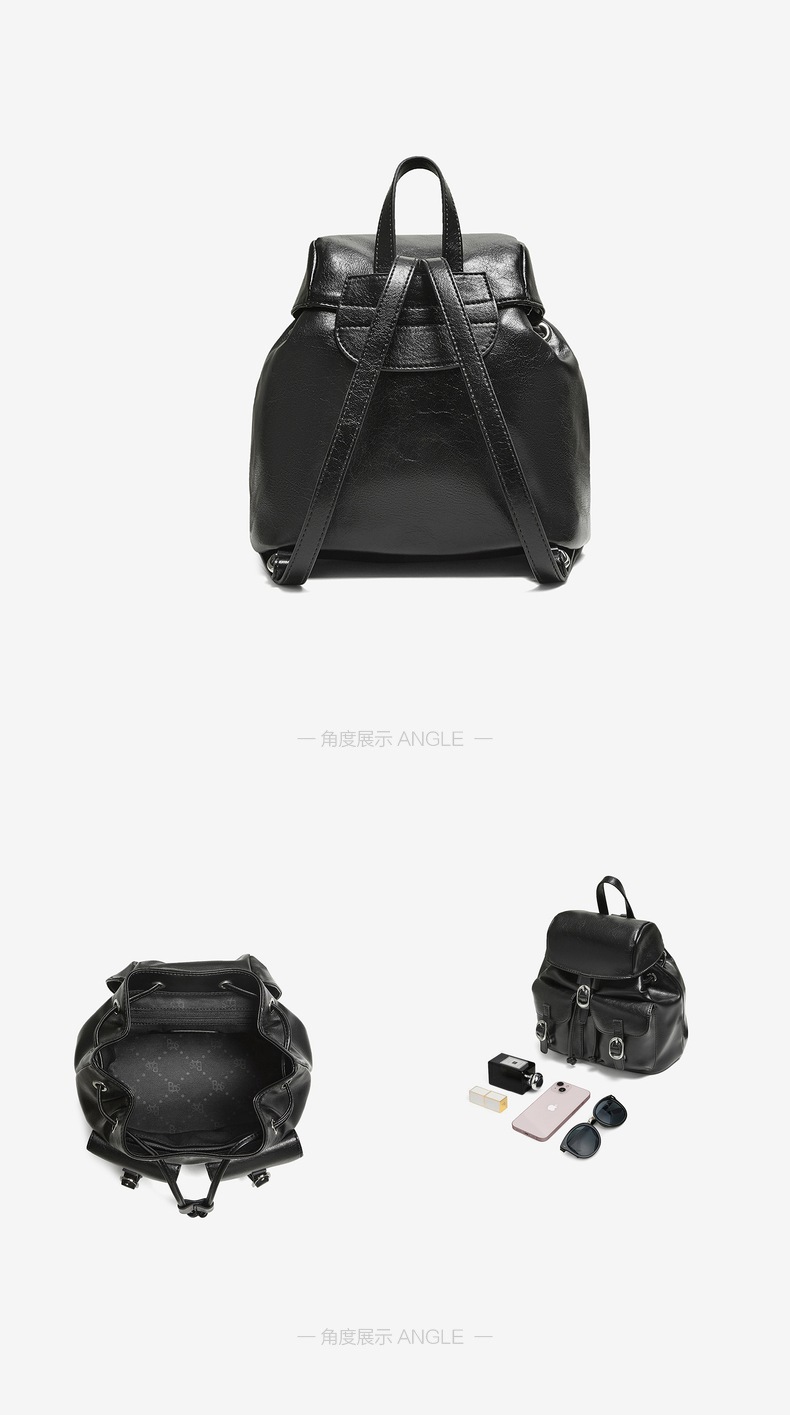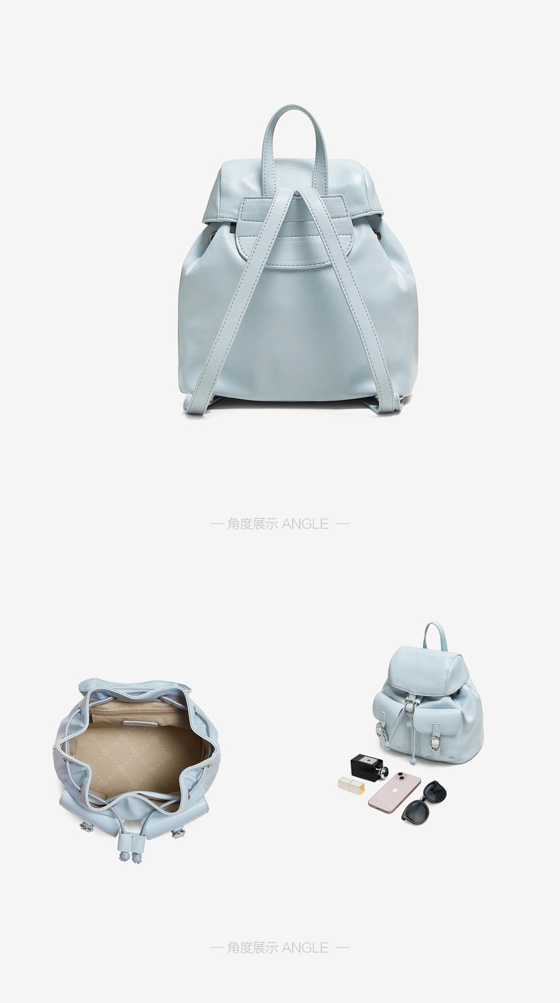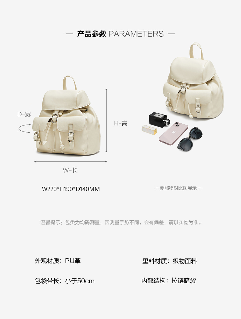 | 流行元素:纯色 | 包的规格:W220*H190*D140MM | 内部结构:拉链暗袋 | 背带方式:双肩 | 风格:OL通勤 |