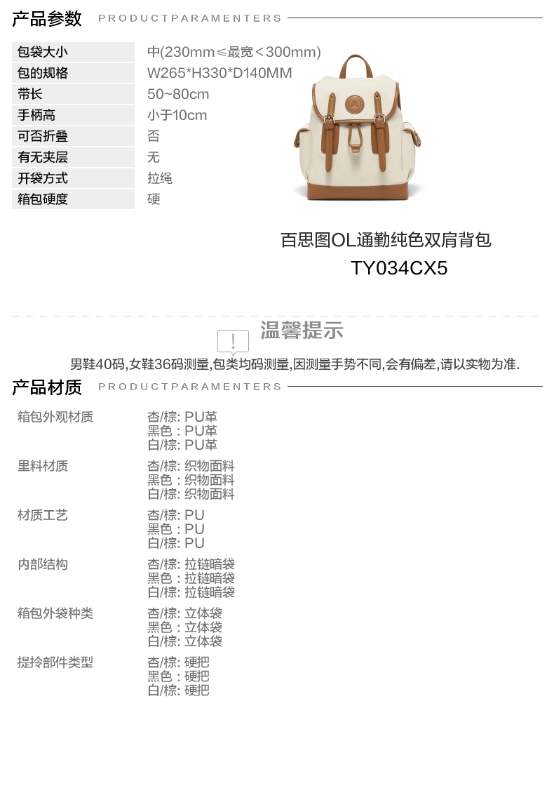 | 流行元素:纯色 | 包的规格:W265*H330*D140MM | 内部结构:拉链暗袋 | 背带方式:双肩 | 风格:OL通勤 |