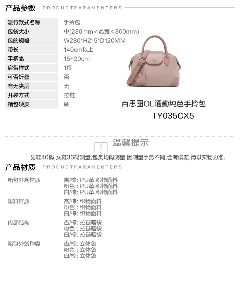 | 色系:粉色 | 适用场景:通勤 | 开袋方式:拉链 | 性别:女子 | 是否防水:否 |