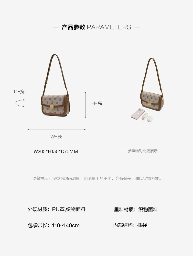 | 色系:棕色 | 适用场景:通勤 | 开袋方式:包盖式 | 性别:女子 | 手柄高:无 |