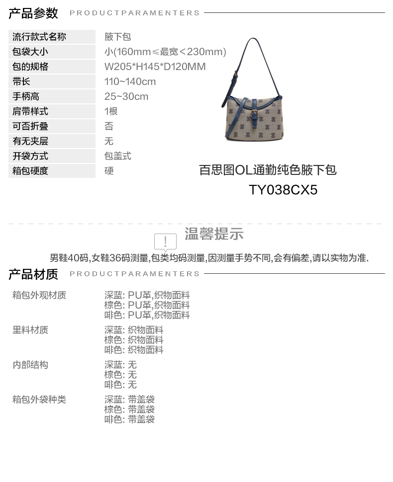 | 适用场景:通勤 | 开袋方式:包盖式 | 性别:女子 | 手柄高:25~30cm | 里料材质:织物面料 |