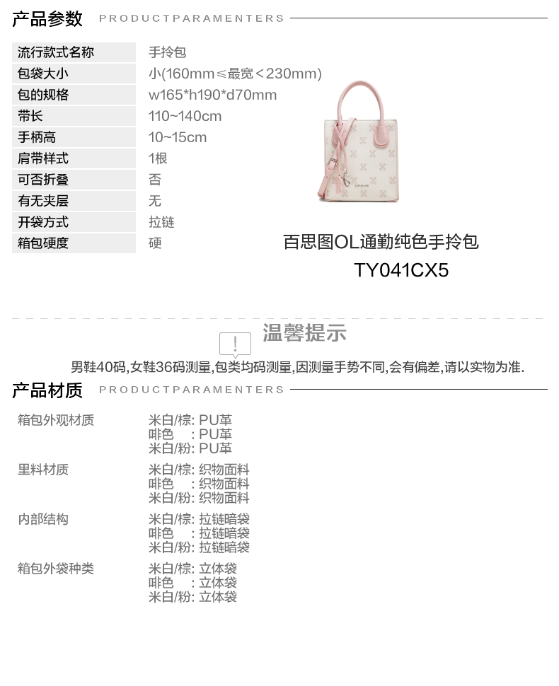 | 适用场景:通勤 | 开袋方式:拉链 | 性别:女子 | 手柄高:10~15cm | 里料材质:织物面料 |
