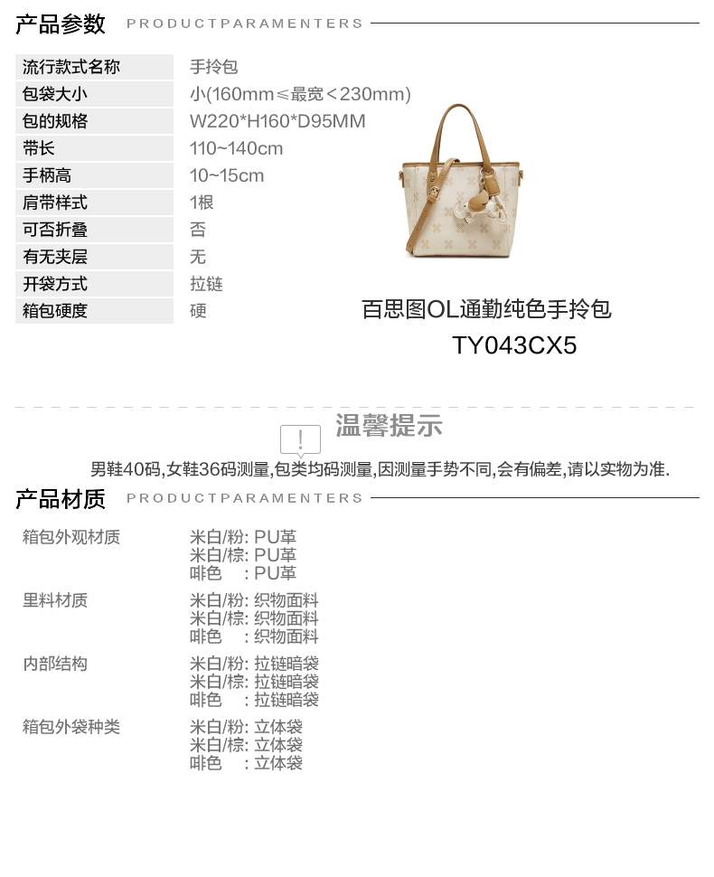 | 适用场景:通勤 | 开袋方式:拉链 | 性别:女子 | 手柄高:10~15cm | 里料材质:织物面料 |