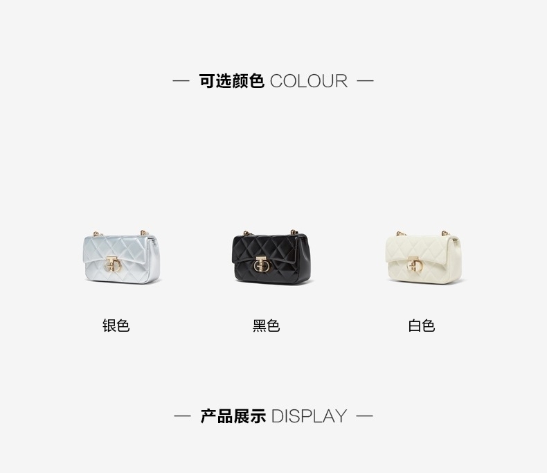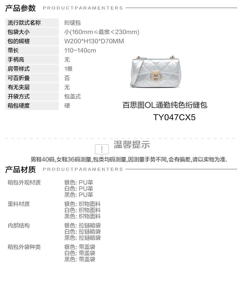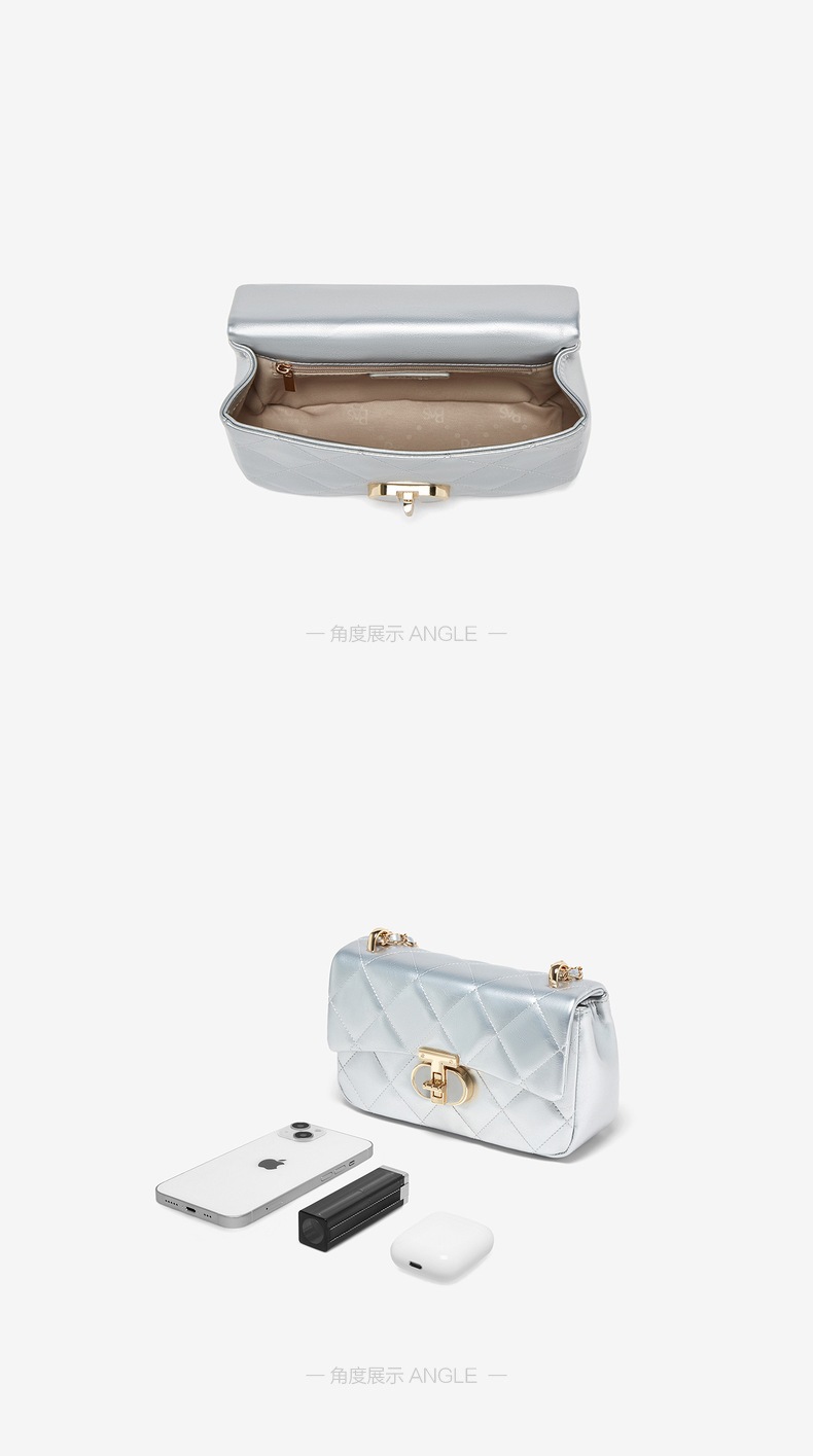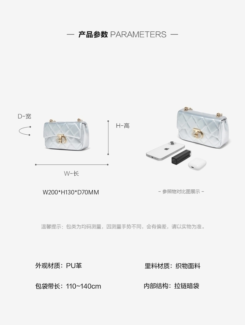 | 包的规格:W200*H130*D70MM | 内部结构:拉链暗袋 | 背带方式:单肩/斜挎 | 风格:OL通勤 | 色系:银色 |